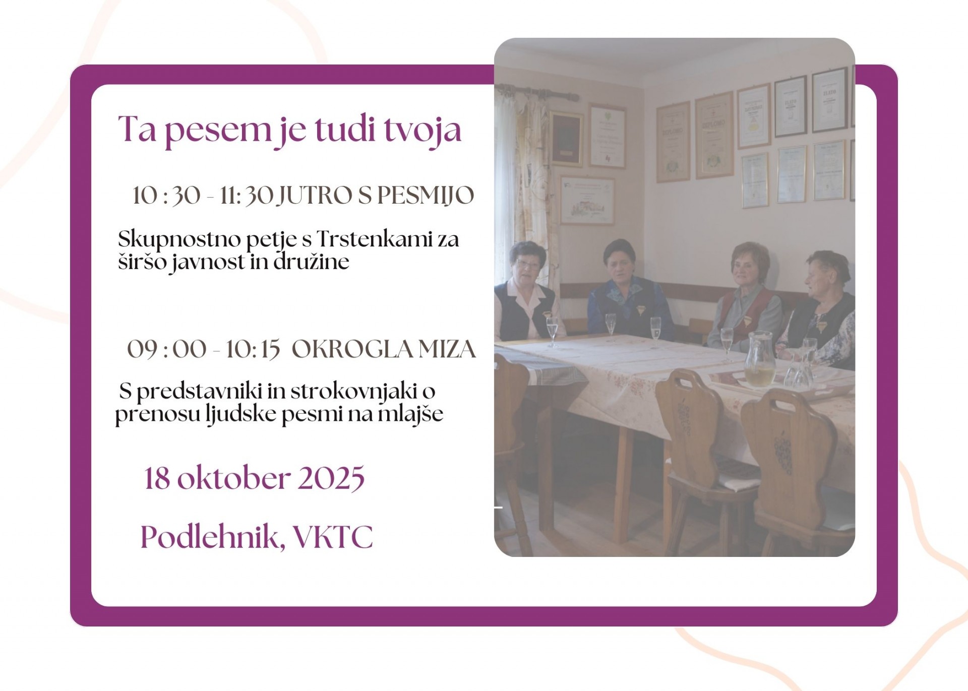 10.30: JUTRO Z LJUDSKO PESMIJO: skupnostno petje za družine in širšo javnost s Trstenkami v Podlehniku.